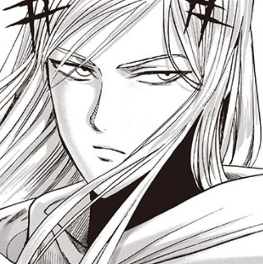 C'est un jeune et bel homme aux très longs cheveux blonds et au regard sérieux. Quelques mèches blondes tombent devant ses yeux. Il porte une cape blanche et une combinaison moulante d'un bleu foncé qui se termine par des chaussures à talon. Il se remarque tout spécialement par les nombreux symboles d'étoiles sur lui. Il y a 2 étoiles noires superposées comme broche sur le flanc droit de ses cheveux, 5 petites boucles d'oreilles en forme d'étoile sur chaque oreille, et un insigne de 2 étoiles superposées sur sa cape au niveau du col. On remarque quelques balafres sur son torse (bien musclé par ailleurs).[4]