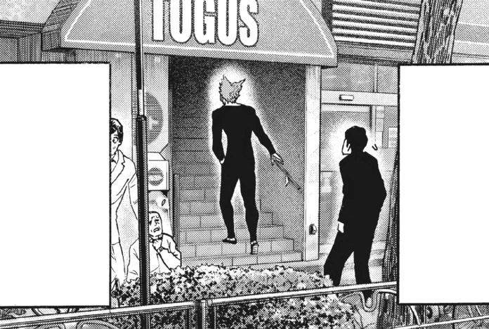 After leaving the Monster Association base, Garou goes to Cafe Togus and orders every meat and salad item on the menu. He wolfs down the meal in a frenzy, drawing the attention of the other diners.