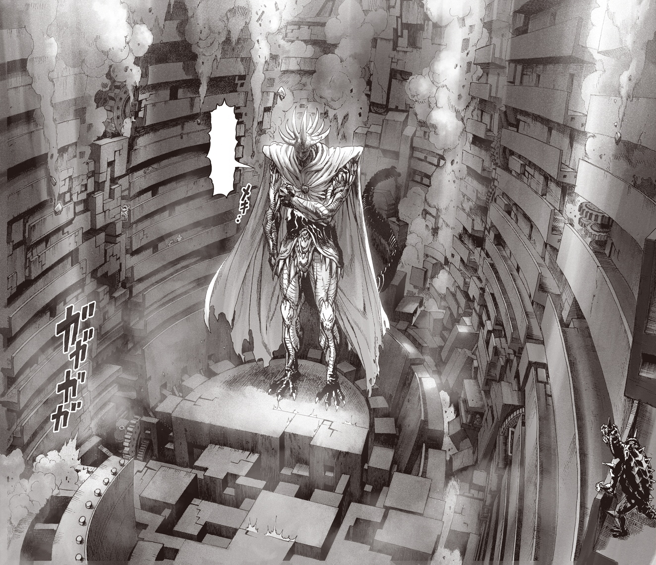 Garou is blasted to the lower levels of the Monster Association Headquarters by an energy blast from Overgrown Rover. Quickly recovering, he finds himself once again in front of Gyoro Gyoro. The monster acknowledges Garou's resilience and offers him another chance to join, but Garou refuses, choosing instead to attack as part of his ongoing hunt. Gyoro Gyoro attempts to restrain him with psychic powers, but they have little effect, and Garou continues to resist. With the Hero Association raid team approaching, Gyoro Gyoro decides not to prolong the fight. Just as Garou is about to strike, Gyoro Gyoro calls on Orochi.