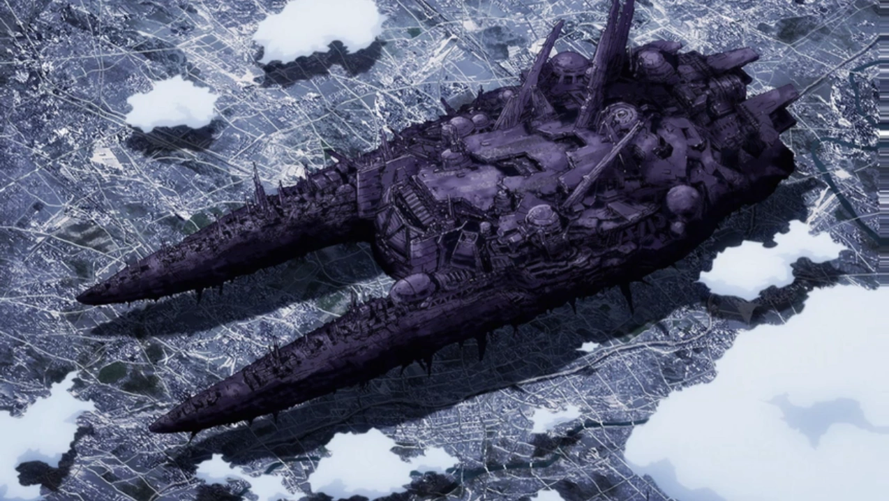 In the manga and anime, the ship is shaped like a tooth. In the manga, the ship is colored steel black, while in the anime, it is purple.[3] The ship was massive in size, to the point where it cast a shadow over the majority of A-City;[3]