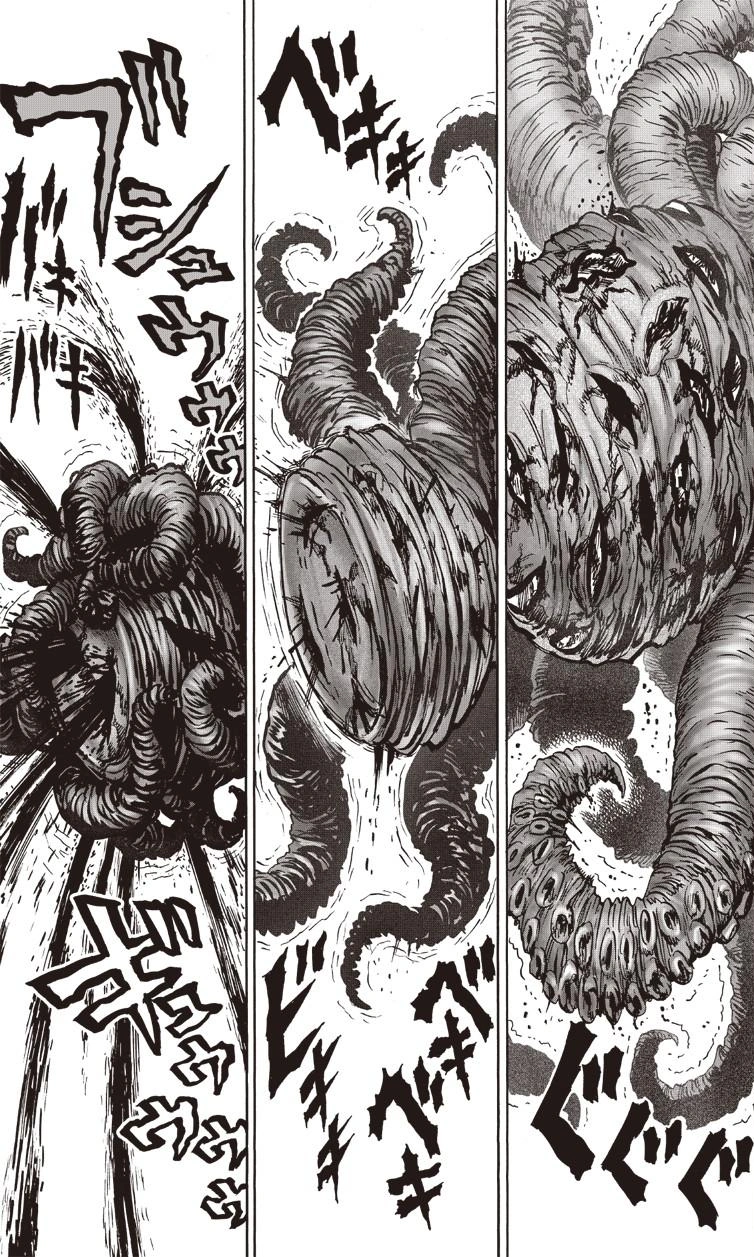 The heroes realize Tatsumaki has arrived to deal with the monster. The esper uses her powers to crush the octopus, squirting blood in the process, some of which almost lands on Tatsumaki but is prevented from doing so by a psychic barrier she puts up. Smile Man remarks that she's crushing the octopus like an empty soda can. The esper thrusts the monster into the ground, having compressed it into a giant ball and effectively killing it.