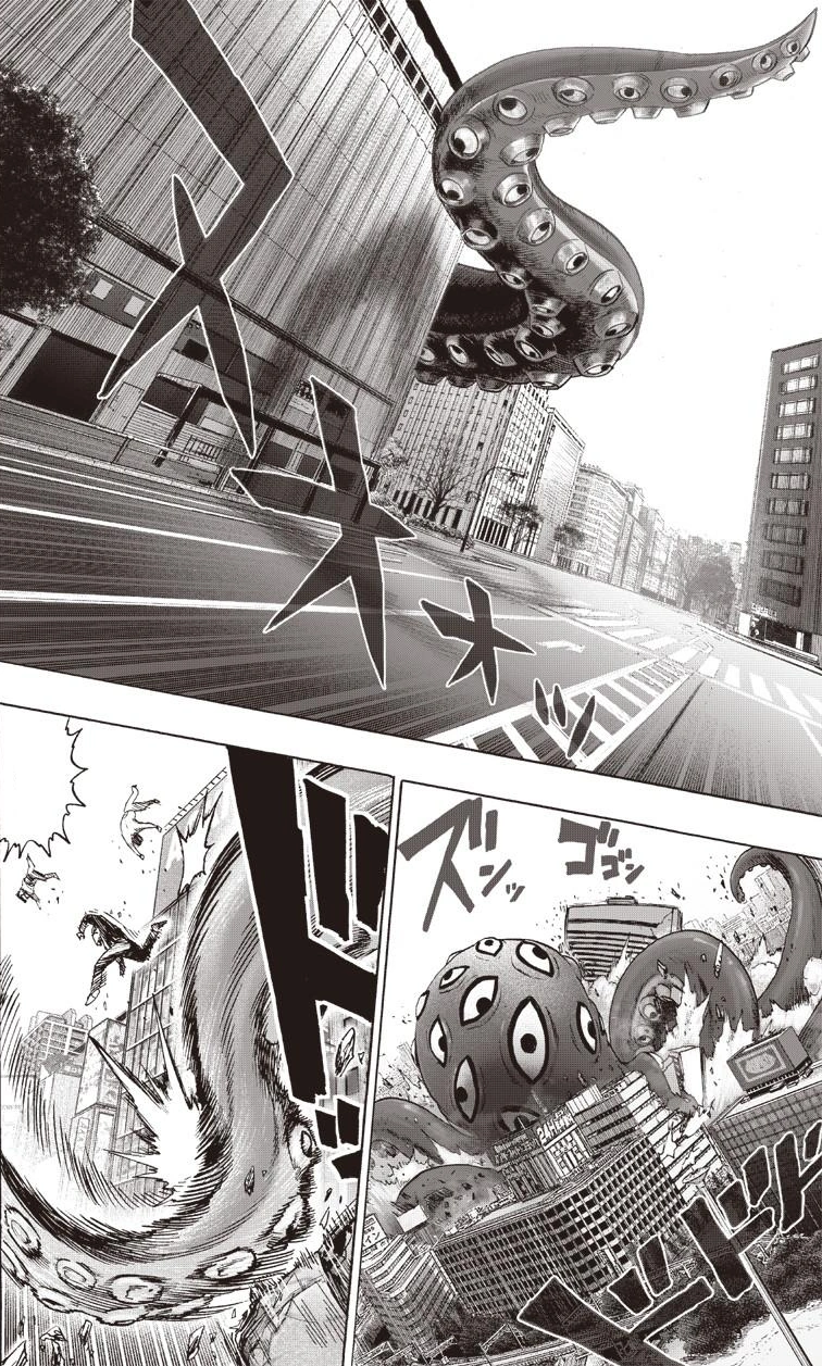 Flashy Flash mocks Death Gatling by saying that eyes are weak spots for all animals, and no fancy analysis was required to realize that. Smile Man suggests a coordinated attack, but before he can even finish his sentence, Flashy Flash blitzes forward, creating large shock-waves in the process. He proceeds to stab Hundred-Eyes Octopus in one of its eyes with his katana. He continues doing this with the rest of his eyes in a very short period of time, shocking all the heroes watching. Flashy Flash jumps into the air and stabs the final eye, while the rest of the eyes simultaneously spurt out blood. Blood spills all over the city, and Flashy Flash flicks the blood off of his cape. Red Muffler is amazed by the S-Class hero's power and is confident the battle is over.