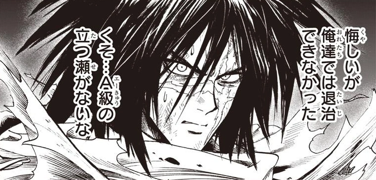 Tatsumaki proceeds to deride the other heroes for not being able to deal with the threat while they're so short-handed. Narcissistoic tries to say they were already dealing with the threat, but Butterfly DX tells him to stop, saying it's no use. Tatsumaki next directs her insults to Flashy Flash, telling him that he should start acting like an S-Class hero and do his job properly. Flashy Flash instantly yells back, insulted that she snatched the prey he'd cornered. The other A-Class heroes urge him to stop, saying they have no desire to be dragged into their quarrel. Tatsumaki leaves with saying the heroes are beyond useless, and Flashy Flash leaves with frustration over so many heroes sticking their noses where they don't belong. As Death Gatling watches the heroes leave, he expresses internal frustration of their failure to defeat Hundred-Eyes Octopus, remarking that the A-Class heroes lost serious face today.