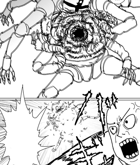 The Hero Name Victims Association intervenes in an attempt to stop Mirror. Frustrated, it fires an energy ball at a nearby building to intimidate them, blasting a massive hole through the structure and forcing everyone except Saitama to retreat. Mirror dismisses Saitama and prepares to attack him with more energy balls while calling him Caped Baldy. Enraged, Saitama punches the robot into pieces.