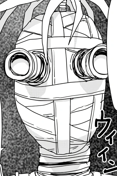 Shunpo is a sleek, wiry machine with a mummy-like head wrapped in bands. From the crown sprout several cable-like tendrils, while twin tubular optics protrude like goggles from the face. The torso is paneled with a central seam and riveted plates that taper to a narrow, ringed waist. Round pauldrons and ribbed upper arms lead to bracer-wrapped forearms and cuffed wrists.